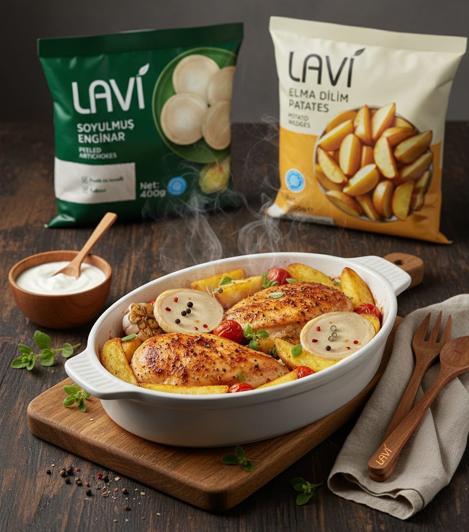 Bu tarifte dondurulmuş Lavi Elma Dilim Patates ve dondurulmuş Lavi Dondurulmuş ve Soyulmuş Enginar kullanarak hem doyurucu hem de sofraya çok yakışan bir fırın yemeği hazırlayabilirsiniz. Aromatik baharatlarla zenginleşen bu kombinasyon, aile yemeklerinden misafir sofralarına kadar pek çok ana öğünde kendine yer bulur.
